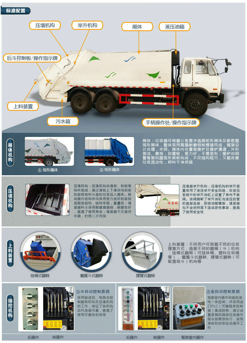 1、該車選用3950,4500軸距底盤。2、隨底盤選裝駕駛室。3、該車有五種可選翻轉(zhuǎn)樣式,A:三角斗裝置,B:掛桶裝置,C:擺臂裝置,D:大落地斗裝置,E:無后翻轉(zhuǎn)裝置。當(dāng)選擇ABCD時(shí),該車前懸(mm)/整車長(mm)/軸距(mm)/后懸(mm)的對應(yīng)關(guān)系為:1450/8470/4500/2520,1250/8270/4500/2520,1450/7920/3950/2520,1250/7720/3950/2520;當(dāng)選擇E時(shí),該車前懸(mm)/整車長(mm)/軸距(mm)/后懸(mm)的對應(yīng)關(guān)系為:1450/8410/4500/2460, 1250/8210/4500/2460,1450/7860/3950/2460,1250/7660/3950/2460。4、防護(hù)材料:Q235碳鋼,連接方式:左右側(cè)面防護(hù)采用焊接連接在副梁上,后部防護(hù)由專用裝置代替豁免。5、選裝ABS, ABS型號為3631010-C2000,生產(chǎn)廠家為東科克諾爾商用車制動系統(tǒng)(十堰)有限公司。6、車輛顏色、文字噴涂及局部細(xì)節(jié)可變化。7、采用發(fā)動機(jī)與油耗值對應(yīng)關(guān)系為(L/100km):ISB170 50/23.8, ISB190 50/23.8, YC4E140-56/23.8。