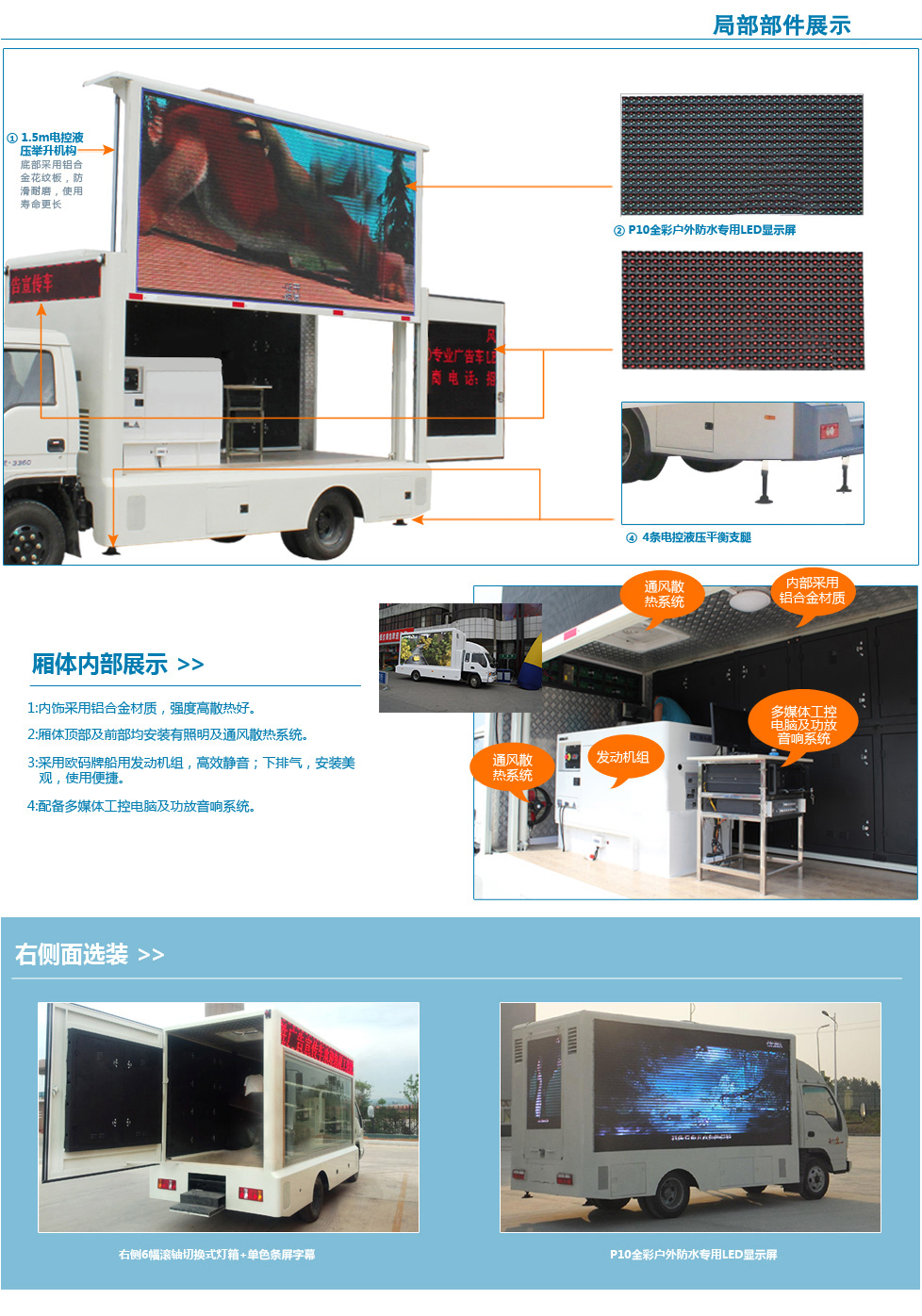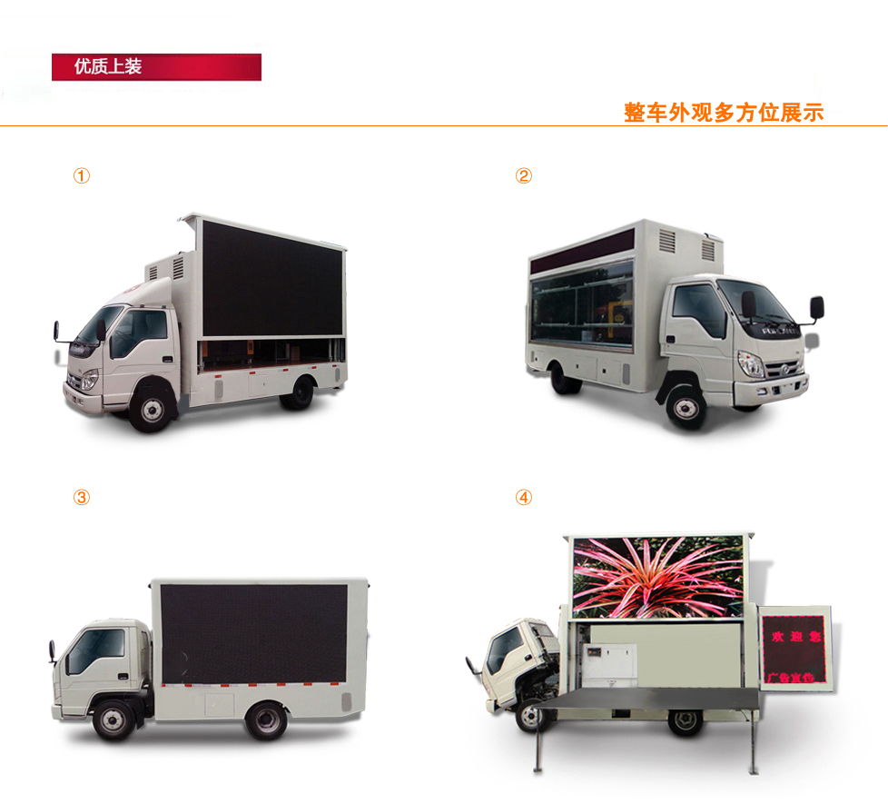 標(biāo)準(zhǔn): 標(biāo)配:主駕駛側(cè)為全戶(hù)外高清防水車(chē)載防震全彩屏,副駕駛側(cè)為數(shù)字滾軸燈箱外加鋼化玻璃,加單色條屏。5cm復(fù)合鋼架廂體,高檔木質(zhì)內(nèi)飾:廂體為圓弧形或者直角形鋼骨架結(jié)構(gòu),地板鋁花紋板、機(jī)電一體化控制、循環(huán)通風(fēng)降溫裝置、安全智能內(nèi)外網(wǎng)配電切換系統(tǒng)、歐碼靜音柴油發(fā)電機(jī)組、千兆媒體控制系統(tǒng)、防震工控電腦一臺(tái)、功放一臺(tái)和防水音柱四臺(tái)。